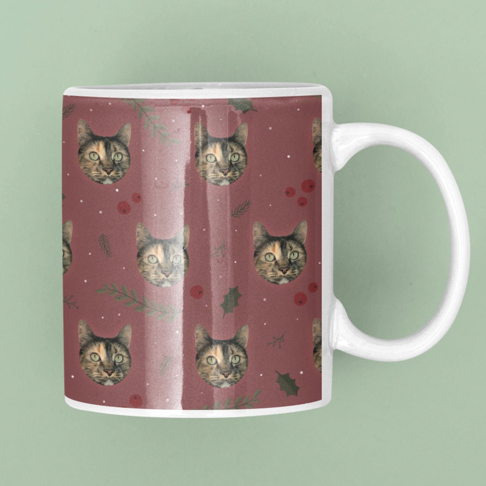 Custom printed for each customer, your cat mug will feature a photo of your beloved pet in a seamless repeating pattern. Whether it’s cats, dogs, or even bunny rabbits, we can put any pet on this ceramic mug for you.