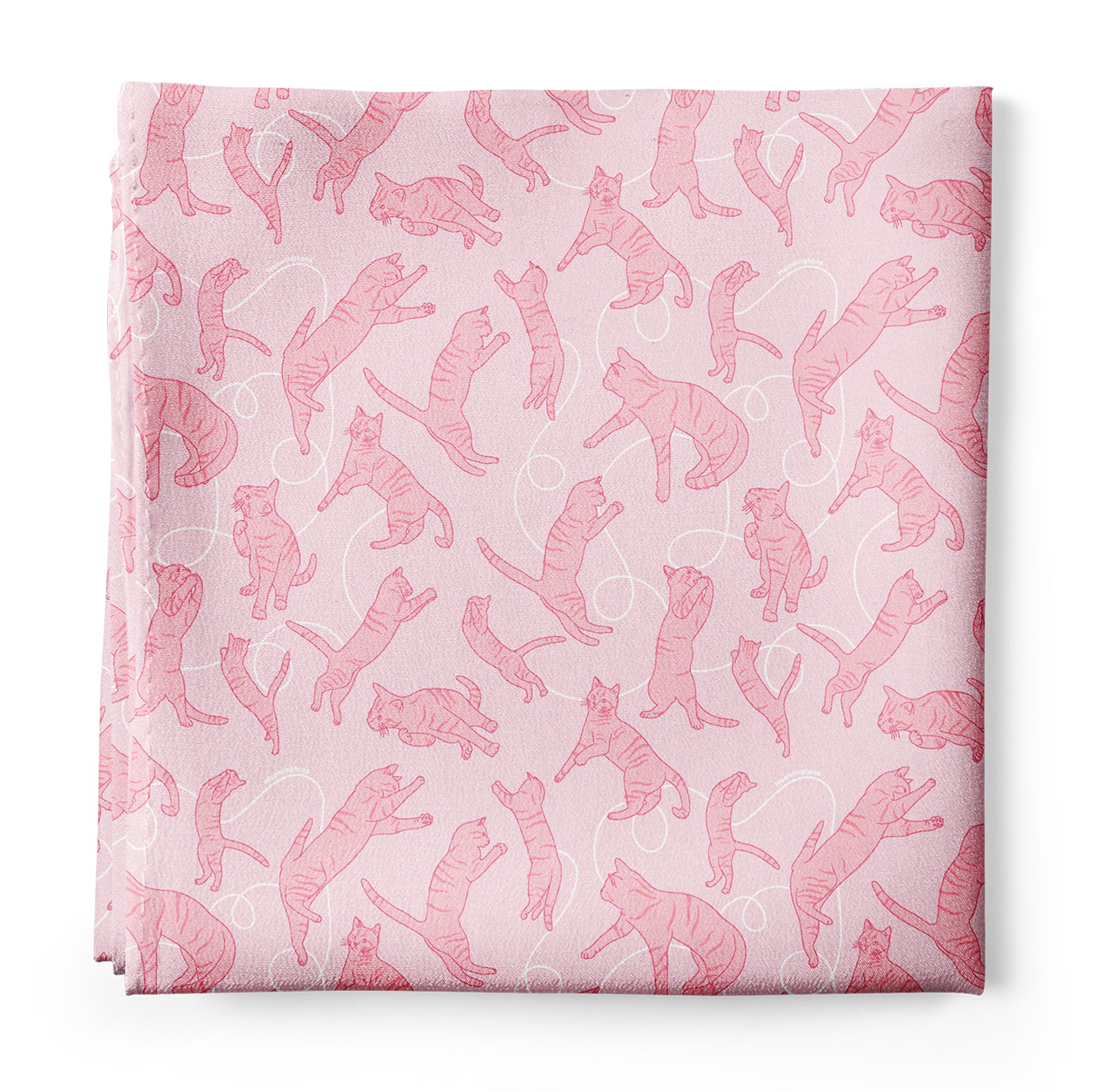 Crafted from 100% silk, this luxurious cat print bandana is the purr-fect way for cat lovers to accessorize no matter the season. Add a pop of pastel pink to any outfit with our Dancing Cats Silk Bandana Scarf, which features a playful pattern of pink cats chasing ribbons through a sky of cotton-candy pink.