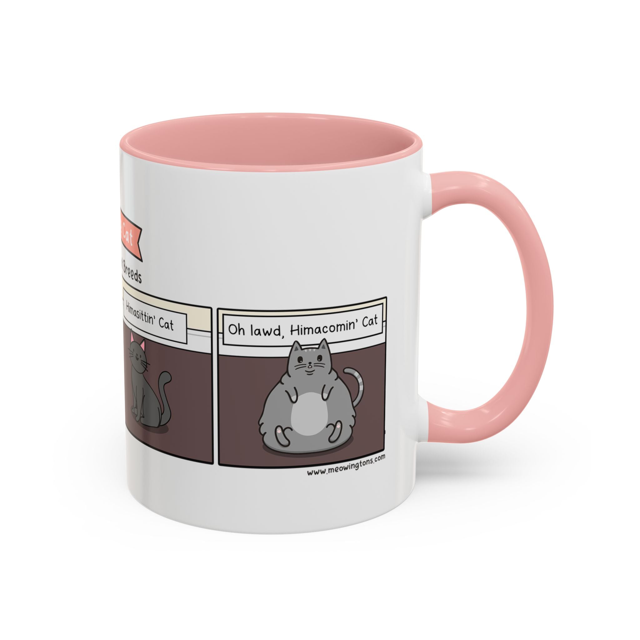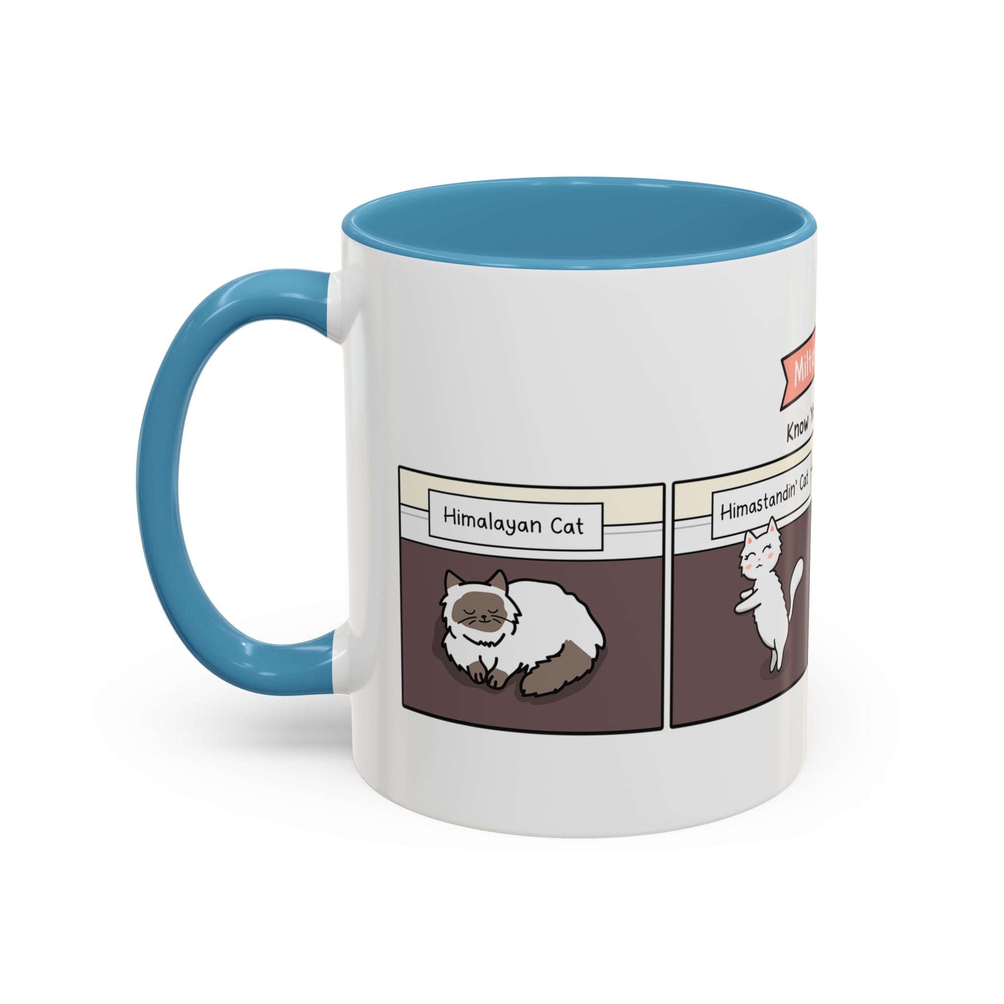 The Know Your Cat Breeds Cat Comic Coffee Mug is available in the following options: 11oz / Navy, 11oz / Pink, 11oz / Light Blue. Check the product page for current stock availability.