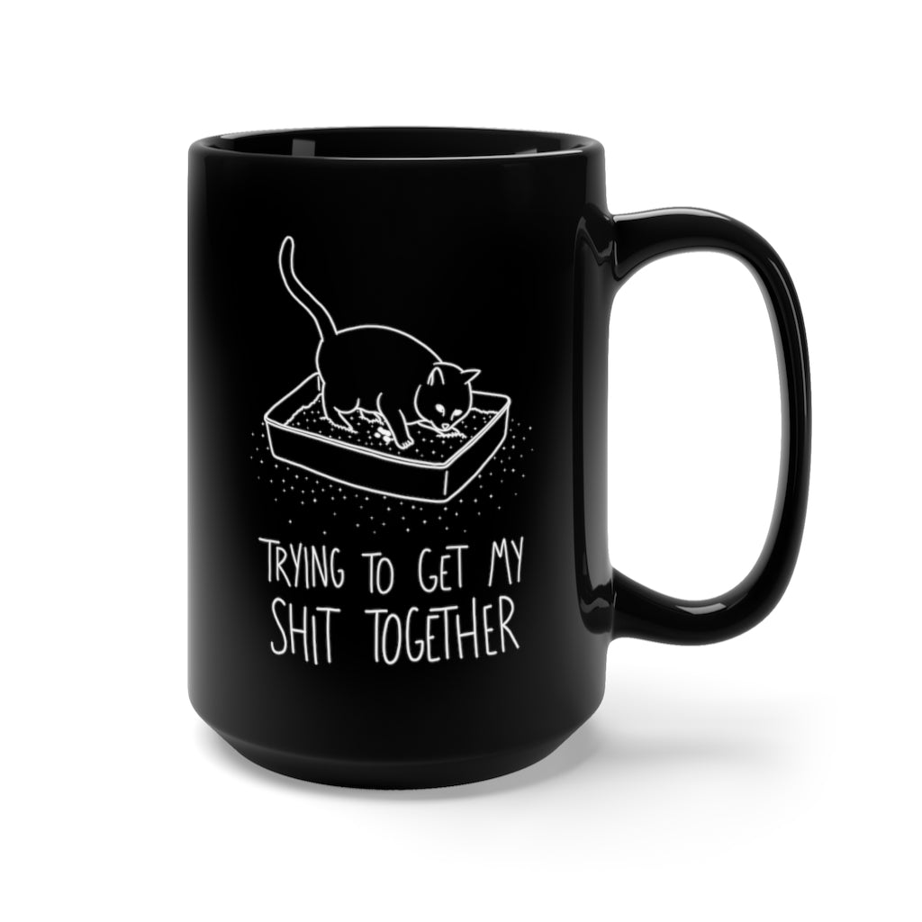 Pobody’s Nerfect. But at least you’re trying to get your shit together. And what better way to inspire yourself than with a sassy cat mug? It's the perfect mug for the office or at home to inspire your day. Our 15-ounce (0.44 l) Shit Together Black Cat Mug is crafted from sleek black ceramic and is dishwasher and microwave safe! Featuring handwritten block lettering that says, “Trying to Get My Shit Together” paired with an illustration of a kitty burying its business in the litter box, this funny cat mug is guaranteed to start your morning off right.